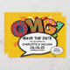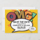 Um divertido, legal e moderno livro de quadrinhos inspirado na pop de arte, salve o convite de data que coloca o wham, zap, pow no seu anúncio de data de casamento. O reverso apresenta um padrão de bolinhas de quadrinhos correspondente que você pode substituir por sua própria imagem ou foto. Projetado por Thisnotme©