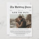 Extra! Extra! Você vai se casar! Este convite de "salve a data" em estilo de jornal torna sua grande notícia oficial. Com um layout preto e branco, uma foto da Torre Eiffel e um design clássico, é perfeito para casais que desejam algo divertido, romântico e único sem gastar muito.