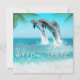Belo Espumante águas oceânicas limpas brilhando à luz do sol, espuma de água branca na praia limpa de areia com frentes de palma e três golfinhos brincando na água. Casual ou formal, para casamento na praia ou na ilha de destino.