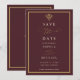 Elegant old money burgundy save the date card with gold accents and classic serif typography. Editable in the Zazzle editor.