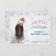 O Natal salve o cartão de encontro com uma fotografia natural de uma lontra fofa que se levanta na água com as patas debaixo do rosto. Vestindo um chapéu de natal vermelho desenhado à mão. Um padrão de fundo em floco de neve atrás do texto.