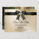Uma ilustração maravilhosa de uma fita preta e dourada falsa brilhante com um diamante embutido repousando contra um conjunto de fitas pretas e douradas sobre um fundo dourado falso cintilante que tem modelos pretos para a sua mensagem personalizada. A parte de trás tem um modelo para a fotografia do casal. Estes são ideais para anúncios formais e chiques de "save the date". Estes cartões planos luxuosos e elegantes irão deliciar os seus convidados.