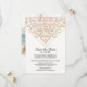 COR PREENCHIDA MUDÁVEL: Basta selecionar uma cor de fundo e os redemoinhos do padrão damasco em renda irão mudar para você. Esta cor de fundo é rosa beije Hex# ffd9cb. DESIGN: Audrey Jeanne criou graficamente este design de convite de casamento ousado, porém simples, no estilo damasco em renda. No verso está a imagem da sessão de fotos do noivado que é facilmente personalizada usando os campos de modelo fornecidos. Moderno e simples. Redemoinhos e arabescos contemporâneos no estilo damasco vintage são delineados em uma aparência brilhante dourada produzida graficamente, combinada com uma borda interna dimensional com aparência metálica dourada. Sutil e elegante. Sofisticado, porém acessível. Ideal para os seguintes temas de casamento: casamentos de primavera, verão, outono ou inverno, casamentos em jardim ao ar livre ou evento formal