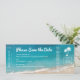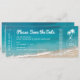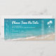 Casamento de Destino de Praia Salve o Cartão de Datas que Parece um Bilhete de Avião Embaralhando Passagem apresenta um oceano tropical azul profundo e turquesa e praia de areia macia com ondas caindo para a costa, e fontes modernas casuais e divertidas em um design simples. Há espaço na parte de trás para viagem e detalhes de acomodações opcionais para que seus hóspedes se ocupem reservando a viagem.