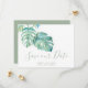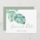 Anuncie seu noivado com meu tropical, salve os convites de data com a opção Salvar nossa data em um estilo de tipografia de script de tendência que evoca o aspecto da letra da mão. Esta simples carta mostra a minha cor d'água original de folha de palma de monstera com seus nomes, data de casamento e local do casamento. Cartões invertem a cor verde de sábio sólido complementar. Perfeito para Chaves tropicais da Flórida, Caribe, Havaí e casamentos de destino. Para ver a suíte de casamento correspondente, visite DotellABelle no Zazzle.
