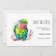 Salve o cartão de data com uma ilustração de papagaio fofo. Um pequeno papagaio verde com cores azuis e amarelas se misturando. O pescoço tem um tom vibrante de rosa avermelhado.