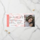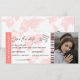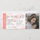 Convite de casamento moderno com passagem de embarque monograma com um fundo branco e salmão simples, uma foto do casal noivo, um avião com uma trilha em loop e um modelo de salvar data personalizado que é fácil de personalizar. Não se esqueça de atualizar o texto do monograma no verso.