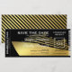 Passagem de embarque de cruzeiro salve a data bilhete com um fundo preto elegante, uma silhueta de navio de cruzeiro em folha de ouro falsa elegante e um modelo de texto sofisticado que é fácil de personalizar.