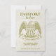 Estes casamentos divertidos, exceto os cartões de data, são feitos para ter a sensação de um passaporte americano. A frente é uma textura branca de couro e uma impressão de ouro incluindo uma águia americana. As costas se assemelham à dentro do passaporte com uma foto e carimbos bonitos de chegada listando seu destino de casamento. Excelente maneira de deixar seus amigos e família saberem manter a data aberta para viajar ao seu casamento.