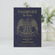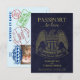 Estes casamentos bonitos, que salvam os cartões de data, são concebidos para se parecerem com um passaporte americano com um fundo marinho de couro azul, e águia americana, e impressão de ouro. As costas se assemelham à dentro do passaporte com uma foto e carimbos bonitos de chegada listando seu destino de casamento. Excelente maneira de deixar seus amigos e família saberem manter a data aberta para viajar ao seu casamento.
