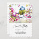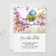 Salve o cartão de data com uma fotografia incrível do pássaro mais bonito empoleirado num galho coberto de flores cor-de-rosa e folhas verdes. O pássaro tem uma cabeça azul e corpo amarelo com um rosto muito doce. Adorável.