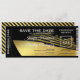Passe de embarque de cruzeiro salve a data ticket com um fundo preto elegante, uma silhueta de navio de cruzeiro em folha de ouro falso e um modelo de texto sofisticado que é fácil de personalizar.