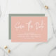 A caligrafia moderna economiza a data em cor de pêssego e verde-sábio com um código QR digitalizável para um site ou informações de contato no verso.
