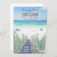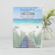 Este belo "Salve a Data" apresenta uma elegante cena aquosa de um píer de praia de madeira que desce às águas turquesas. Ideal para um casamento elegante na praia.