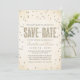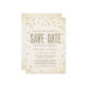 Este casamento moderno e na moda salva a design de anúncio de data da "The Spotted Olive™" apresenta uma imagem de pontos confetti de aparência dourada em um fundo de tempo macio com a palavra "SAVE THE DATE" preenchida com uma imagem de brilho dourado. NOTA: ESTE DESIGN APRESENTA UMA IMAGEM DO GLITTER CONFETTI. NÃO HÁ GELETTER, CONFETTI OU EMBELÉDIOS. ESTE É UM DESIGN DE IMPRESSÃO PLANA. COPYRIGHT ©2014 The Spotted Olive™. Todos os Direitos Reservados.