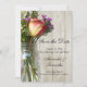 Cartões de salve a data. Fotografia de um pote de vidro transparente com uma rosa vermelha e amarela, e flores silvestres roxas, brancas e amarelas. Um tema encantador para um casamento natural, de verão, ao ar livre e vintage. Tema de jardim selvagem de verão, com tábuas de madeira levemente caiadas ao fundo. Todos os Designs Copyright © www.CustomInvitesOnline.com