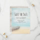 Salve o cartão de data com uma bela e tranquila imagem. Cores sutis de azul claro, marrom arenoso e branco suave. Uma cena de praia com um barco na praia e um farol desbotado à distância com pássaros voando ao redor. Um olhar elegante.