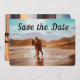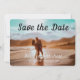 Foto de casais românticos de praia tropicais de destino moderno com tipografia de script, salve o cartão de data. Personalize com três fotos, uma na frente e duas atrás. design de excelente de de Designs TLS.