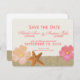 Save the date de casamento na praia com um estilo vintage e o visual rústico de aniagem, todos acentuados com hibiscos, dólares de areia e estrelas-do-mar, personalize o texto e as fontes para se adequar ao seu estilo.