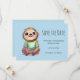 Cartão de salvar a data com uma ilustração adorável apresentando uma preguiça feliz vestindo uma camiseta verde.