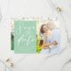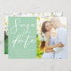 Esta foto de casal verde macia Salve a data o convite apresenta tipografia branca-chic para uma doce cerimônia de primavera ao ar livre. Simples e elegante simples em cartões verdes pastéis sólidos tranquilos para um local de jardim.