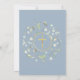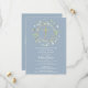 Uma grinalda decorativa de folhagem e uma cruz dourada repousam sobre as informações de save the date da sua primeira comunhão especial num fundo azul poeirento.