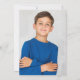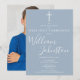 Elegante convite de primeira comunhão dourado para salvar a data com uma assinatura elegante de nome em script em um fundo de azul empoeirado e foto especial no verso. Personalize com as informações do seu evento especial em letras chiques. Projetado por Thisisnotme