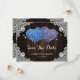 Romantic rustic purple and blue floral wedding save the date card featuring hydrangea flowers against a barn wood background adorned with white floral lace and twinkle lights.