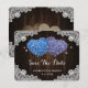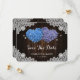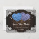 Romantic rustic purple and blue floral wedding save the date card featuring hydrangea flowers against a barn wood background adorned with white floral lace and twinkle lights.