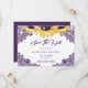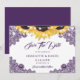 Elegant purple wedding save the date card featuring sunflower flowers, string lights and delicate floral lace. Matching items available.