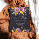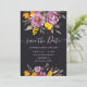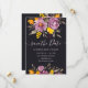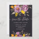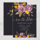 No outono elegante, casamento de roxo floral de inverno, salve a data com uma caligrafia moderna e elegante, o casamento de Script em flores roxas, laranja e amarelas com folhagem verde sábio em preto escuro.