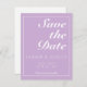 Casamento bonito, moderno, minimalista e moderado Salve a data com um fundo pastel roxo macio com blocos de texto personalizáveis brancos em fontes modernas. Adicione o código QR do seu site de casamento personalizado no verso.