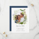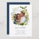 Elegante botânico salva as datas tem uma foto de noivado favorita cercada por uma coroa redonda de bolota e folhas em uma elegante paleta de aquarelas cinza e verde com flores azuis sólidas. Personalize com seus nomes, data do casamento e local.