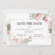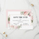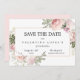 Clássica Quinceanera floral Salve a data com rosas rosa pinceladas e suaves. As rosas de aquarelas estão aninhadas em folhas verdes e folhagem. Um elegante quadro fino de ouro rodeia seus detalhes da Quinceanera. Eles são escritos em uma combinação de fontes tradicional. Todo o texto é editável.