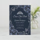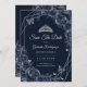 Navy blue and silver Quinceanera celebration save the date card. Features, script font, glitter silver butterflies, watercolor roses and tiara. Perfect for an elegant princess style glam celebration. Personalize with your own details. Printed Zazzle cards or instant download digital printable template.