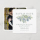 Um cartão de anúncio de data de salvamento perfeito para o tema floral suculento da moda que é tão popular hoje! Um lindo buquê de plantas suculentas em belas tonalidades de verde poeirento, azul, cinza e lavanda são inspirados nas cores deslumbrantes dessas pequenas plantas incríveis. O texto cinza-claro suave fica impressionante contra o fundo branco crocante. No verso, uma foto dos noivos é emoldurada em branco. Veja todos os nossos outros produtos coordenados na linha "Buquê Suculento" para criar um belo conjunto de casamento combinando.
