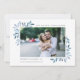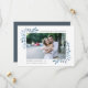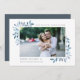 Anuncie seu próximo casamento em estilo chic com nossas elegantes cartões salve a data fotográficas. Graciosos pedaços de folhas de cor azul clara e bagas moldam sua foto, com seus detalhes de casamento no topo e no fundo.