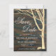 O roteiro de madeira escura da árvore rustica salve o cartão de data. A design apresenta a textura rustica da madeira escura, uma árvore simples e flocos de neve brancos. O texto está em uma escrita branca moderna.