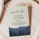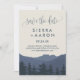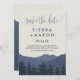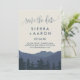 Este retiro às montanhas, para salvar o cartão de data é perfeito para um casamento moderno. O design apresenta uma serena cordilheira azul-aquática com uma floresta de árvores verdes em primeiro plano.