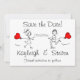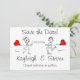 Este moderno super fofo Salve a Data anunciada é certo que vai sorrir de todos os seus hóspedes! Apresentando um casal desenhado por vetor que corre em direção um ao outro com balões vermelhos em forma de coração em suas mãos. Muito fácil de personalizar com suas informações!
