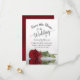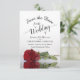 This wedding Save the Date card is romantic, elegant, classy, and beautiful. It features a photograph of a single long stemmed red rose reflecting in a pool of water with waves and ripples. The text is a fancy script calligraphy on a white background. The back features a deep red or burgundy plush pattern. Perfect way to let your friends and family know about your upcoming wedding.