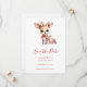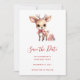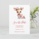 Salve o cartão de data com uma ilustração de um adorável veado bebê. Olhos grandes orelhas com cabeça grande e pequenos galhos castanhos. Vestindo um grande arco vermelho. Ao lado de uma pilha de presentes.