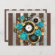 Relógio antigo e patenteado, adornado com joias, mãos de ouro e algarismos latinos com rosa de turquesa sobre fundo castanho e listrado. Estilo Steampunk.