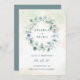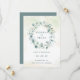 Elegante espanhol Save The Date card com a dentro "Reserva La Fecha" de uma coroa composta por folhas de eucalipto e verde com uma dica de azul. Abaixo estão os detalhes do seu casamento em verde escuro sobre uma lavagem a aquarela pastel com manchas de brilho sujo. A parte de trás é uma sombra correspondente de verde azul macio. Esta simples e rústica design é excelente para um casamento de temas botânicos no verão.