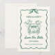 Prepare-se para anunciar seu casamento de uma forma divertida e inesquecível com este cartão Save the Date caprichoso e ilustrado à mão! Perfeito para os casais modernos e elegantes, este design atual é criado com um estilo único e casual que traz alegria e personalidade ao anúncio do seu casamento. A ilustração apresenta um carro de casamento clássico com balões em forma de coração, adicionando um toque leve que reflete a emoção da sua celebração futura. Enquadrado em uma borda delicada e ondulada com um laço charmoso no topo, o apelo vintage deste design é realçado por uma cor verde fresca e vibrante, tornando-o uma escolha perfeita para casais que amam uma mistura de romance clássico e simplicidade moderna.