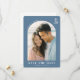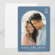 This wedding save the date card features a modern, romantic design with an arched top border framing a central photo placeholder. The deep blue background contrasts beautifully with soft pastel hues in the image, creating a warm and inviting atmosphere. Elegant typography combines serif and sans-serif fonts for a sophisticated yet contemporary look, while customizable placeholders allow for personalization. Perfect for setting the tone for a beach-themed celebration, this card exudes a sense of intimacy and anticipation.