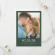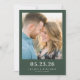 This wedding save the date features a romantic and intimate photograph of two individuals, framed by a solid dark green border. The design uses a warm color palette with soft golden hues from natural lighting, creating a serene and affectionate mood. Elegant serif fonts highlight the essential details, ensuring clarity and sophistication. The minimalistic style emphasizes the candid moment captured in the photo, making it perfect for couples looking to share their upcoming nuptials with loved ones.