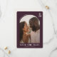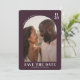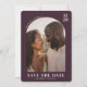 This wedding save the date card features a modern and elegant design with an arched top border framing a central photograph of two individuals smiling warmly. The color palette includes a deep maroon background complemented by soft peach tones in the clothing, creating a romantic ambiance. Clean typography is used for the customizable text elements, ensuring clarity and balance. The overall mood is joyful and intimate, perfect for setting the tone for a special occasion.