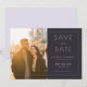 This wedding save the date design features a split layout with a warm, softly focused photograph on one side and a sleek navy blue background on the other. The left side captures an intimate moment between two individuals in a cityscape during sunset, while the right side showcases bold, modern typography announcing "Save the Date" in crisp white letters. Customizable text fields allow for personalization of names, dates, and location details, making it perfect for couples planning their special day. The contemporary style blends realism with graphic elegance, creating a sophisticated yet inviting mood ideal for celebrating love and commitment.