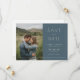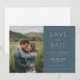 This wedding save the date features a split layout with a heartfelt photograph of a couple embracing in a field on one side, and a clean navy blue panel with modern typography on the other. The design combines natural elements with contemporary style, using a muted color palette that transitions smoothly from greens to blues. The bold, sans-serif font highlights essential details while maintaining an elegant and minimalist aesthetic. Perfect for setting the tone for a memorable event, this design exudes warmth and anticipation, inviting guests to mark their calendars for a special celebration.